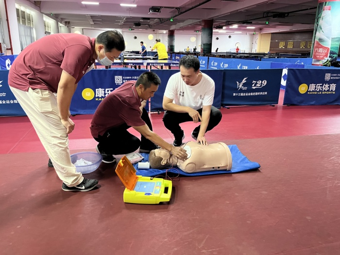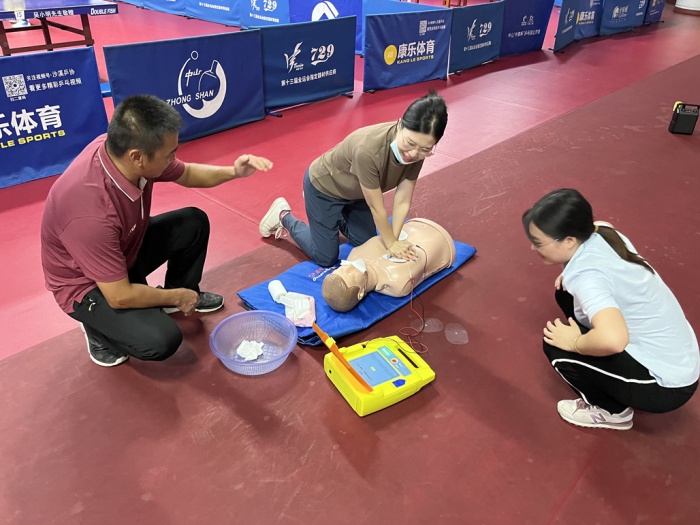 2022年5月29日13:00分左右,市乒乓球館二樓一名69歲老人在打乒乓球期間突發(fā)心臟不適,隨即暈倒在地、意識不清,中山市乒乓球館工作人員立即撥打120急救電話,同時現(xiàn)場數(shù)名市民群眾輪流、不間斷地對該球友實施心肺復(fù)蘇按壓和人工呼吸,興中網(wǎng)球場工作人員夏忠和黃思泳迅速、及時取來了自動體外除顫儀AED設(shè)備對老人實施救助,直至13:23分120急救人員趕到,將老人送往醫(yī)院救治。短短10多分鐘,場館工作人員和市民無間合作,上演了一場教科書式的搶救。次日下午,老人脫離生命危險,轉(zhuǎn)換康復(fù)治療。在緊急情況下,場館工作人員沉著冷靜,利用專業(yè)的急救技能挽救了市民的生命,得到了市紅十字會的贊揚。