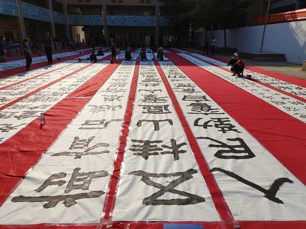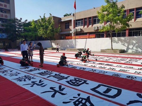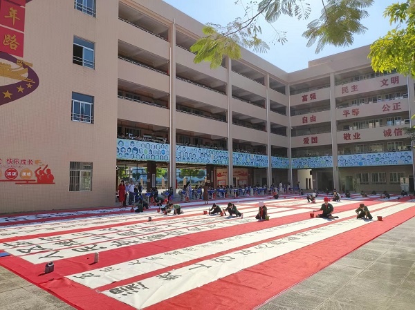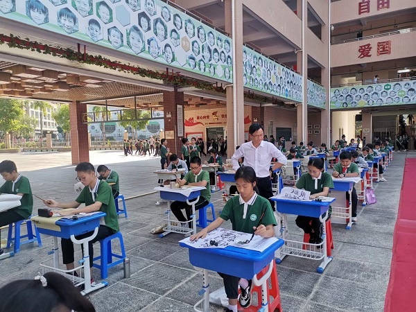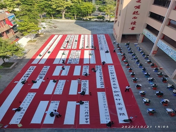 參加現(xiàn)場書法展示的為學(xué)校中小學(xué)書法社團(tuán)成員,場地分為大字展示區(qū)和常規(guī)書寫展示區(qū),場面蔚為壯觀。教學(xué)樓下630平方米的地面上鋪著紅毯,25名同學(xué)拿著大毛筆行走于白紙之間揮毫,進(jìn)行書法創(chuàng)作。常規(guī)書寫展示區(qū)的44名同學(xué)滿懷激情,用心書寫每一個(gè)筆畫、每一個(gè)漢字,盡其所能展示自己的書寫水平。作品透著或規(guī)范、或嚴(yán)謹(jǐn)、或靈動(dòng)的氣質(zhì)。書寫內(nèi)容基本選自紀(jì)念珠江縱隊(duì)成立五十周年專輯《五桂烽火》中的詩句。詩句激勵(lì)著五桂學(xué)子書英烈、學(xué)英雄。活動(dòng)中,陳玉玲副校長為大家現(xiàn)場展示書法,鼓勵(lì)鞭策在場的同學(xué)們寫好中國字,做好中國人。整個(gè)活動(dòng),同學(xué)們認(rèn)真品味著書法的藝術(shù)魅力,飽蘸濃墨、激揚(yáng)文字。“書道雖深,志誠可達(dá)”,同學(xué)們?nèi)褙炞?,將身心融于筆端,揮灑書寫之豪氣,一撇一捺,起轉(zhuǎn)鋒回,字字溢香。