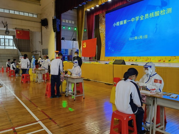 根據(jù)國內(nèi)新冠肺炎疫情變化的復雜情況,為加強防控工作,保障師生健康安全,按照市鎮(zhèn)有關(guān)要求,2022年4月2日,小欖鎮(zhèn)第一中學在學校體育館再次開展了全員核酸檢測工作。檢測期間,在小欖一中校長呂麟、副校長陳源斌等行政陪同下,小欖鎮(zhèn)教體文旅局副局長鄧煒明、鎮(zhèn)教育和體育事務(wù)中心副主任曾文春前來巡查了該項工作。來自東區(qū)社區(qū)衛(wèi)生站的醫(yī)務(wù)人員為師生們進行核酸采樣。