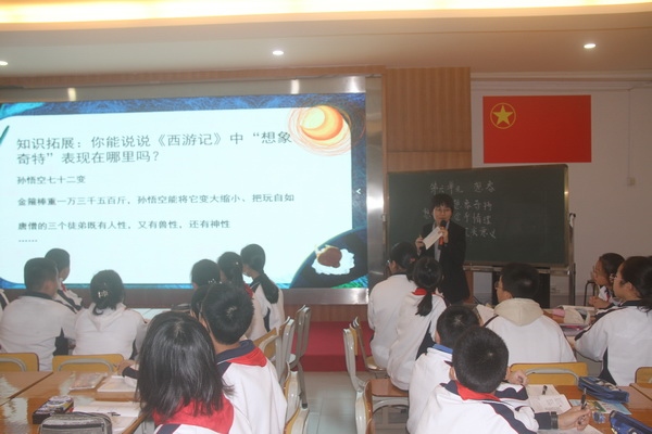 與會(huì)領(lǐng)導(dǎo)和教師首先開展聽課活動(dòng)。小欖一中青年教師陳蕾以《想象:換一種眼光看世界——統(tǒng)編版七年級上冊第六單元整體教學(xué)設(shè)計(jì)》為內(nèi)容,通過課堂學(xué)習(xí),讓學(xué)生理解和把握課本單元中“想象”的特點(diǎn)和內(nèi)涵,感受優(yōu)秀想象作品的奇思妙想,進(jìn)而發(fā)展創(chuàng)造性思維,運(yùn)用所學(xué)知識(shí)創(chuàng)作想象類作品,為大家呈現(xiàn)了一節(jié)精彩生動(dòng)的公開課。