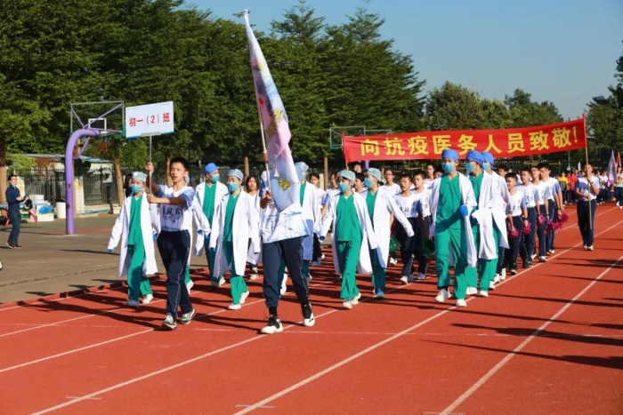 初一年級同學(xué)們身著各種職業(yè)服裝,致敬醫(yī)生護士、社區(qū)疾控、公安民警、交通警察、消防警察、快遞小哥、物流司機、送菜農(nóng)民、建設(shè)工人、北斗導(dǎo)航工程師、5G技術(shù)人員工人、化身主播實施線上教學(xué)的老師、志愿者……口號、橫幅、展板等將他們的故事展演,向偉大的時代英雄致敬。