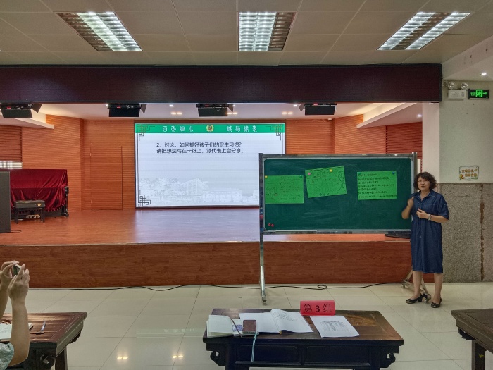 接著老師們就《如何抓好孩子們的衛(wèi)生習慣》展開了分組討論,大家各抒己見,點子新穎接地氣。每個小組派一個代表上臺發(fā)言,有設置小組管理員的,有整理抽屜比賽的,有家校合作促發(fā)展的等等。