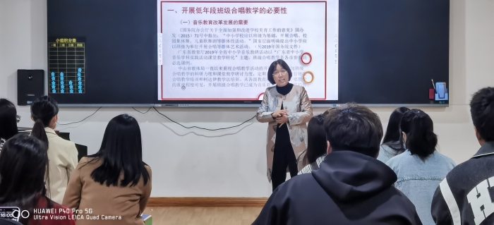 隨后,市級(jí)課題《小學(xué)低年段班級(jí)合唱教學(xué)實(shí)踐研究》主持人煙洲小學(xué)黃秋玲老師開展了題為《小學(xué)低年段班級(jí)合唱教學(xué)策略分析》的講座。黃老師通過分析《國(guó)務(wù)院辦公廳關(guān)于全面加強(qiáng)和改進(jìn)學(xué)校美育工作的意見》和《義務(wù)教育藝術(shù)課程標(biāo)準(zhǔn)(2022版)》指出在小學(xué)低年段開展合唱教學(xué)的必要性,結(jié)合中山市中小學(xué)生音樂能力底線標(biāo)準(zhǔn)的教學(xué)要求,提出在小學(xué)低年段開展班級(jí)合唱的教學(xué)策略:改編教材歌曲,讓合唱教學(xué)有米可炊;運(yùn)用柯爾文手勢(shì)提高學(xué)生的音準(zhǔn)水平;運(yùn)用節(jié)奏讀法培養(yǎng)學(xué)生的節(jié)奏感;運(yùn)用豐富的形式訓(xùn)練學(xué)生的合唱能力;運(yùn)用熟悉的歌曲進(jìn)行二聲部練習(xí)。黃老師在講座中特別強(qiáng)調(diào)在低年段實(shí)施班級(jí)合唱教學(xué)必須建立在準(zhǔn)確歌唱的基礎(chǔ)上。
