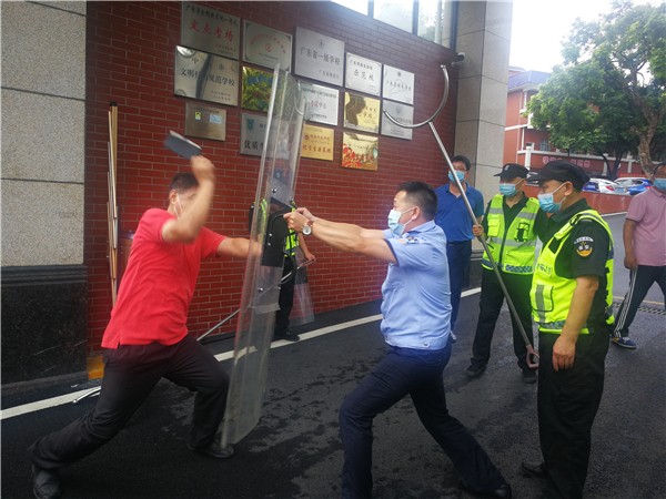 一名校外人員想進(jìn)入學(xué)校,保安首先在防撞欄內(nèi)耐心勸其離開(kāi),校外人員不聽(tīng)從指揮,先是大聲怒罵保安,接著跨過(guò)防撞欄,對(duì)保安進(jìn)行肢體攻擊,保安嚴(yán)厲警告后,使用警械將其控制,然后報(bào)告公安機(jī)關(guān)和學(xué)校高考考務(wù)組。模擬演練過(guò)程嚴(yán)謹(jǐn),動(dòng)作規(guī)范,學(xué)校保衛(wèi)人員熟悉了高考校門安保流程,掌握了警用器械操作方法,力求做到校門安全保衛(wèi)萬(wàn)無(wú)一失。我校劉莉祥副校長(zhǎng)和悅來(lái)南派出所蔣警官指導(dǎo)了本次高考安保反恐演練,后進(jìn)行了及時(shí)的總結(jié)。