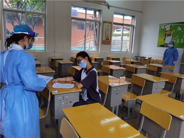 校外考生進(jìn)入我校考點(diǎn)過(guò)程中測(cè)溫發(fā)現(xiàn)該生體溫超過(guò) 37.3℃ , 學(xué)校啟動(dòng)應(yīng)急響應(yīng),按要求進(jìn)行處置,同時(shí)上報(bào)。當(dāng)復(fù)檢結(jié)果顯示學(xué)生體溫仍然過(guò)高時(shí),學(xué)生被帶至醫(yī)務(wù)留觀室,由評(píng)估組醫(yī)生作出專業(yè)研判。工作人員做好考生情緒輔導(dǎo),醫(yī)務(wù)人員帶領(lǐng)考生到備用隔離考場(chǎng)準(zhǔn)備考試。考試結(jié)束后,應(yīng)急人員陪同考生赴定點(diǎn)醫(yī)院發(fā)熱門診進(jìn)行排查。消殺組對(duì)隔離考生所在考室及考場(chǎng)外公共區(qū)域進(jìn)行消毒,駐校防控組醫(yī)生全程參與和指導(dǎo)。