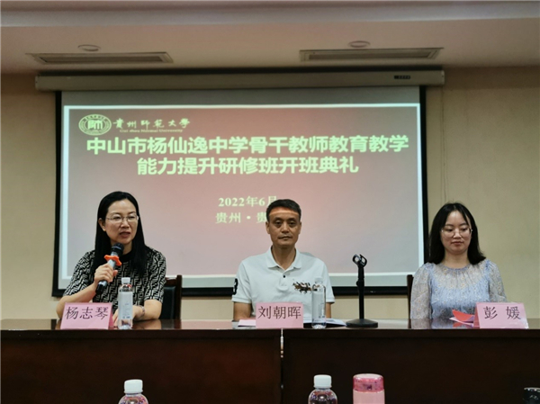 在研修班開班典禮上,國家級專業(yè)技術(shù)人員繼續(xù)教育貴州師范大學基地彭媛主任代表承辦方致辭,歡迎中山市楊仙逸中學的教師們前來研修交流學習。彭媛主任對貴州師范大學的教育教學資源和成果進行了介紹,就本次培訓(xùn)的安排作了詳細的安排部署,并表示衷心希望研修班的學員不負千里之行,在今后教學中師逸功倍。