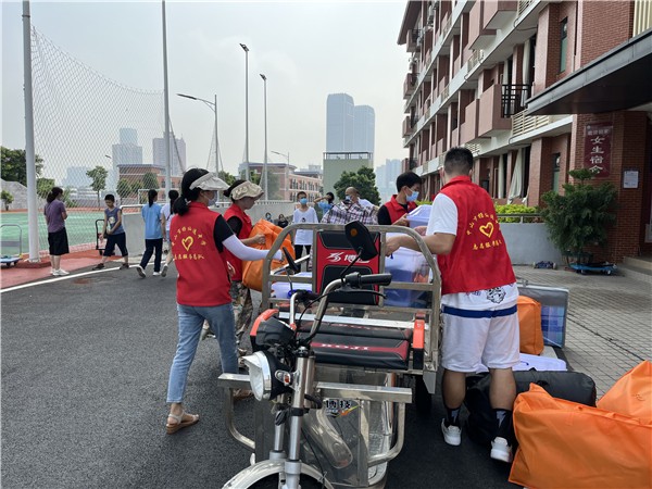 從中山二路天橋下到校門口,從校門口到學(xué)生宿舍這短短的路程,設(shè)置了多個志愿服務(wù)站點(diǎn),紅馬甲與綠色熒光服成為這條迎新路上最亮麗的顏色。以“心”迎新,志愿先行。學(xué)校行政、黨員教師、班主任、保安后勤、宿舍教官、高年級學(xué)生、實(shí)習(xí)生志愿者和轄區(qū)交警共同組成這支志愿者隊(duì)伍,維持交通秩序,指引新生入校。
