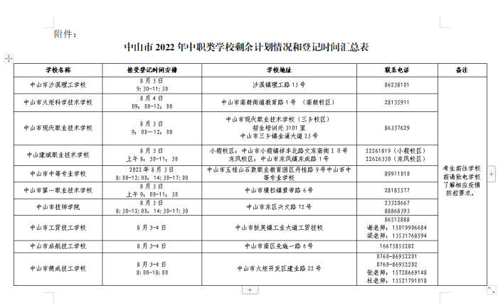 我市2022年中職類學(xué)校統(tǒng)一錄取已于7月29日結(jié)束。根據(jù)各中職類學(xué)校目前注冊報到的情況,仍有部分專業(yè)有少量剩余計劃,經(jīng)研究決定,尚未被學(xué)校錄取且有意向就讀的考生,可攜帶身份證、我市中考準考證到相關(guān)學(xué)校辦理就讀申請,各個學(xué)校的登記安排詳見附件。