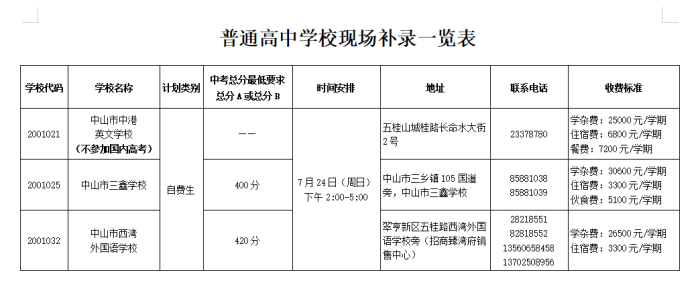 中山市2022年普通高中統(tǒng)一投檔錄取工作已于7月22日完成。目前,中港英文學(xué)校、中山市三鑫學(xué)校、中山市西灣外國語學(xué)校等民辦學(xué)校尚有少量自費生計劃未完成。現(xiàn)定于7月24日(周日)下午2:00-5:00進(jìn)行現(xiàn)場補(bǔ)錄工作,請符合相關(guān)條件、有意向入讀的考生和家長于指定時間前往學(xué)校進(jìn)行書面申請(具體詳見附件)。