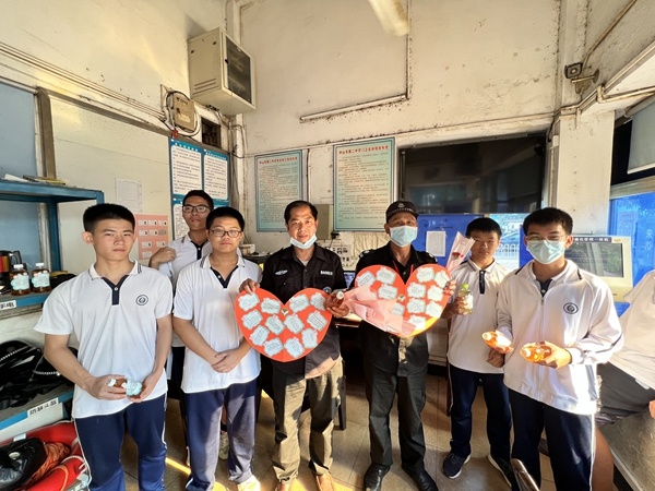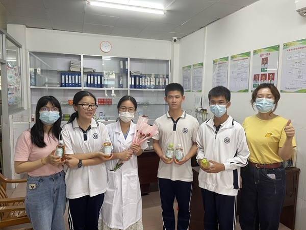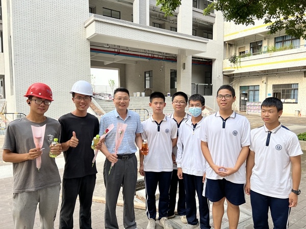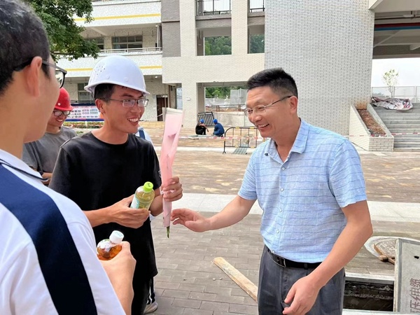 活動開始了!集合完畢,準備出發(fā)。同學(xué)們分成幾個小隊來到校醫(yī)辦公室、門衛(wèi)室、校園建筑工地、宿舍辦公室,向所有的后勤老師及工作人員送上祝福。一朵花、一瓶水、一聲祝福,那代表著最真誠的感謝。吳祥明校長也與同學(xué)們一道,向辛勤的建筑工人們送上鮮花和飲品,代表同學(xué)們感謝他們的辛勤勞動。