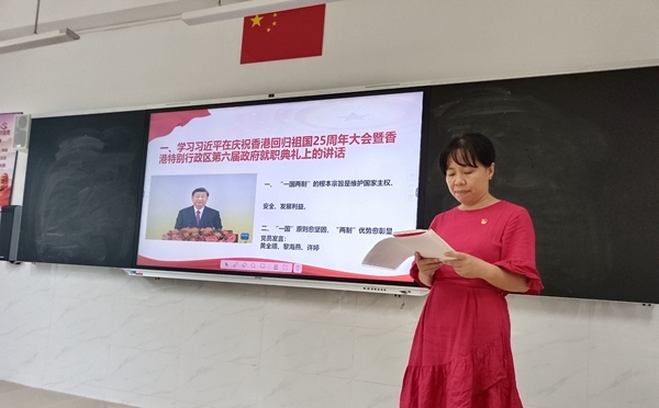 首先由部組織委員馬興蘭同志帶領(lǐng)全體黨員一起學(xué)習(xí)了《習(xí)近平在慶祝香港回歸祖國25周年大會暨香港特別行政區(qū)第六屆政府就職典禮上的講話》,主要內(nèi)容有:“一國兩制”的根本宗旨是維護(hù)國家主權(quán)、安全、發(fā)展利益;“一國”原則愈堅(jiān)固,“兩制”優(yōu)勢愈彰顯。黃全順、黎海燕、許婷等同志作為黨員代表紛紛表態(tài):“一國兩制”是創(chuàng)舉,是具有強(qiáng)大的生命力,是確保香港長期繁榮穩(wěn)定、維護(hù)香港同胞福祉的好制度。