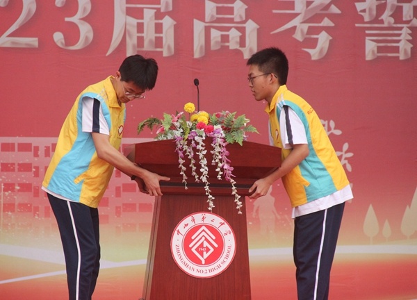 正心立誓,賡續(xù)華章。成年不僅意味著年齡的變化,更意味著社會角色的轉(zhuǎn)變,領導嘉賓們、家長們?yōu)閷W子戴上成人徽章,披上紅圍巾、贈送《中華人民共和國憲法》。以夢為馬,挑起責任擔當。在莊嚴的氛圍中,團委副書記鐘李斌帶領全體高三學子進行了鄭重的宣誓。