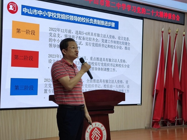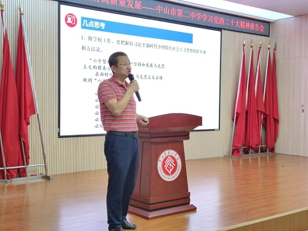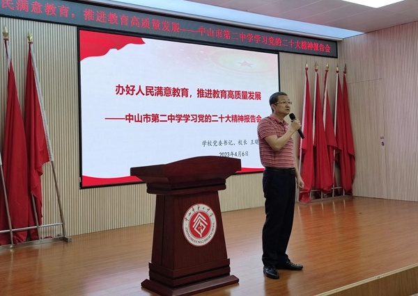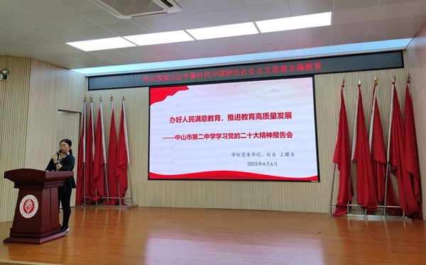 4月6日下午,中山二中全體黨員在階梯室開展主題黨日活動,活動由黨委副書記、副校長梁紅妹同志主持。