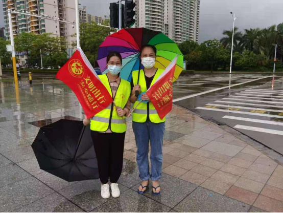 同月,為提高黨員服務(wù)群眾的意識(shí),落實(shí)學(xué)黨史,辦實(shí)事,7月20日,中山紀(jì)念小學(xué)黨支部組織黨員教師在德能東路、港義路路口開展交通勸導(dǎo)志愿服務(wù)工作。志愿者們冒雨進(jìn)行交通勸導(dǎo)工作,在暴雨紅色、臺(tái)風(fēng)黃色預(yù)警的情況下,仍然堅(jiān)持在交通引導(dǎo)崗位,協(xié)助路口的交通疏導(dǎo),全心全意為群眾服務(wù),將黨史學(xué)習(xí)教育走深走實(shí),為2021年暑假創(chuàng)文志愿服務(wù)活動(dòng)貢獻(xiàn)自己的力量。