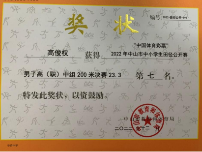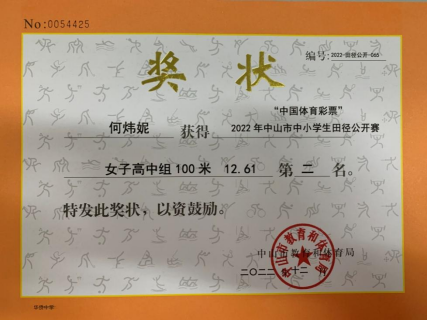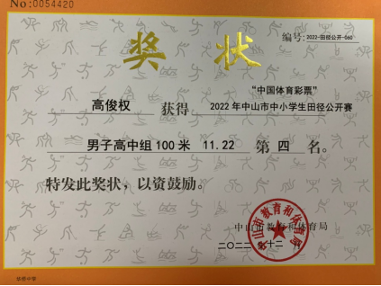 12月10日,“中國體育彩票”2022年中山市中小學(xué)生田徑公開賽在興中體育場開幕。我校派出10位運動員參加角逐高中組比賽,由于疫情原因,有6位運動員不能參加比賽,剩下4位運動員頂住壓力,賽出了自己的水平,最后以總分27分獲得團體第六名的好成績。其中,高三9班梁嘉豪獲得男子跳高冠軍,何煒妮同學(xué)獲得女子100米亞軍。