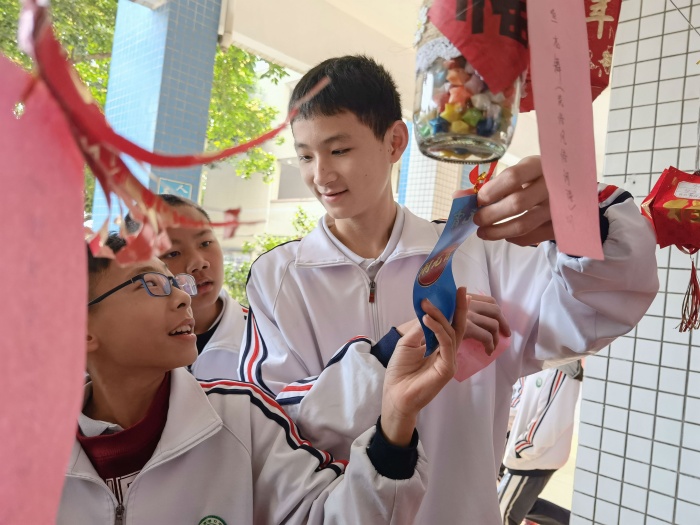 校園大廳內(nèi)掛滿謎語(yǔ)與紅燈籠,布置出了一片喜氣洋洋的猜謎區(qū)。學(xué)生們熱情高漲地尋找自己能猜出的謎語(yǔ),有的結(jié)伴猜謎,有的自己冥思苦想,有正在和同伴商量,也有熱烈討論,為猜對(duì)燈謎的同伴雀躍歡呼,大家都沉浸在歡快祥和的氛圍之中。在傳統(tǒng)佳節(jié)的深厚節(jié)日氛圍里,師生們感受著喜迎新春的歡樂(lè)和共祝祖國(guó)美好發(fā)展的欣喜。