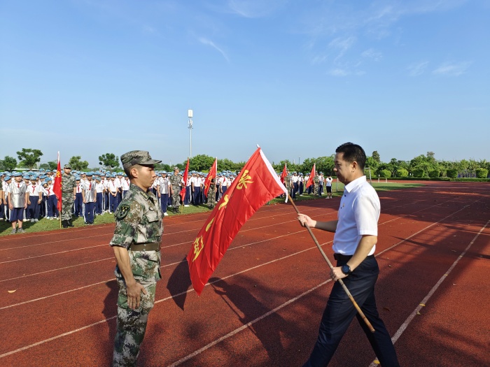 開營儀式上激動(dòng)人心的時(shí)刻就是授旗儀式的時(shí)候了。港口中學(xué)廖志堅(jiān)校長(zhǎng)為初一新生14個(gè)連授連旗。14位教官精神抖擻地接過連旗,挑起了國防訓(xùn)練的囑托和重任。