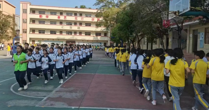 肖偉慶老師介紹說麻榨中學是麻榨鎮(zhèn)唯一的一所公辦初級中學,學生人數(shù)近千人,老師六十多位,恰好是港口中學一半的辦學規(guī)模,麻榨中學位置偏遠,教育資源較為匱乏、工作環(huán)境相對艱苦,但是學生純樸,校風良好,師生關(guān)系融洽?;葜菔薪逃趾吐檎ブ袑W領(lǐng)導重視幫扶工作、關(guān)心支教老師,及時改善寢食條件,在麻榨中學領(lǐng)導的關(guān)心幫助下,肖老師很快就安頓下來并投入到支教工作中。肖老師承擔了5個班的體育教學工作,積極參與到麻榨中學各項教育教學工作中,在支教工作中,肖老師毫無保留地向麻榨中學的老師輸出了港口中學的教學理念、教學模式以及教學經(jīng)驗等。期間,肖老師詳細研究了麻榨中學課間操的組織情況,在征求領(lǐng)導建議后,肖老師與麻榨中學的體育科組通力合作,制定了詳細方案,對升旗和大課間進退場進行合理設計,規(guī)劃升旗隊伍站隊位置,實施年級分場地分項目進行課間活動的舉措,促使升旗儀式和大課間活動更加合理、有序、有效地進行,強化了學生良好行為習慣的養(yǎng)成,推動了學校德育工作的開展。此外,肖老師還開展公開課授課活動,將前沿的體育教學理論帶入課堂,促進了學校體育課堂的改革。