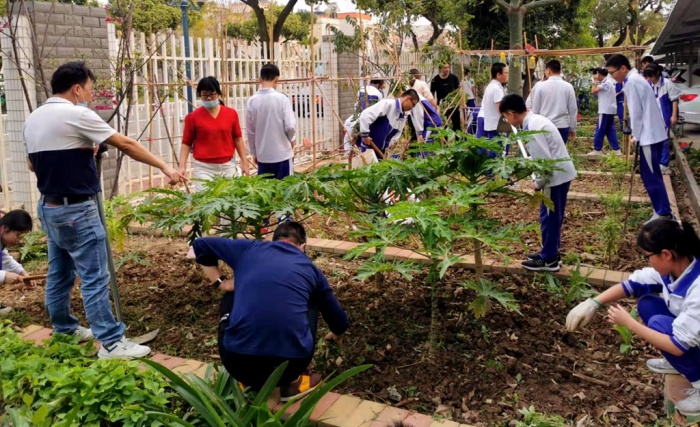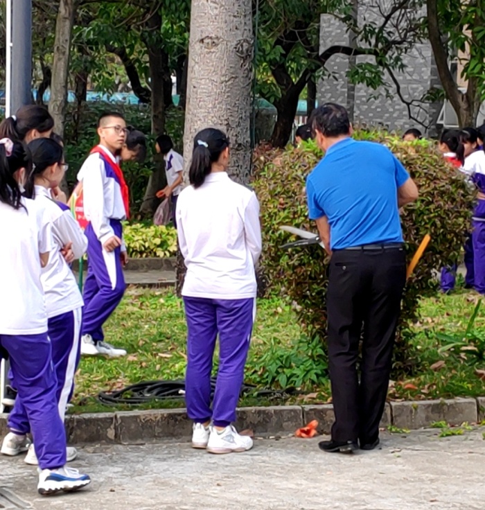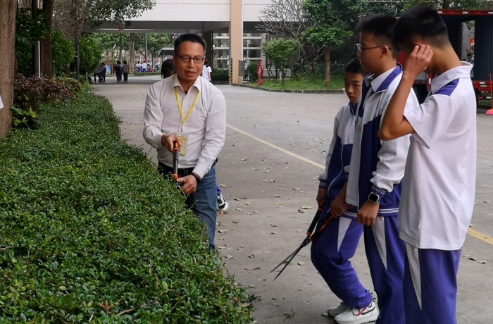 在校園的園藝基地,鐘敏老師、黃小平主任、戴放良主任給參加園藝課程的學生做示范,如何用園藝專用剪刀修剪校園花木和綠化帶。鐘敏老師是一名體育老師,也特別精通種植,操作起園藝剪非常有講究而且很熟練,學生們對園藝課程很喜歡,很感興趣。雖然修剪起來有點難度,很辛苦,滿臉是汗水,但他們很主動,愛體驗,臉上帶著快樂的笑容。