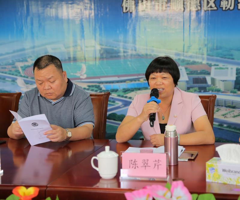 隨后一行人在學校二樓會議室座談,羅勁柏副局長首先做了順德職業(yè)教育發(fā)展的經(jīng)驗介紹。他說,順德職業(yè)教育起步比較早,為產(chǎn)業(yè)升級提供了人才支持。目前,順德共有13所中職學校,有3間國家級示范學校、7間國家級重點學校、3家省重點學校。得益于“一鎮(zhèn)一品牌”的特色,除了兩間區(qū)屬學校,每個鎮(zhèn)街都有一間職業(yè)學校,占地比較大,經(jīng)費的支持基本都對等。隨著順德產(chǎn)業(yè)升級的不斷變化,順德職業(yè)教育的改革也不斷加強,不斷創(chuàng)新職業(yè)教育體制機制,2017年開始實施集團化改革,以推動順德職業(yè)教育新一輪的發(fā)展,創(chuàng)造更多的資源,推動產(chǎn)教融合,吸引企業(yè)主動參與到職業(yè)教育中,為職業(yè)教育提供真實的生產(chǎn)環(huán)境。