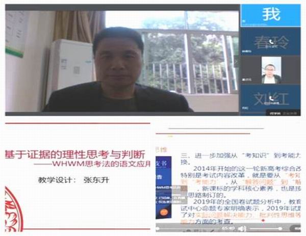 首先大家一起觀摩由工作室主持人張東升老師主講的“基于證據(jù)的理性思考與判斷――WHWM思考法的語(yǔ)文應(yīng)用”專題直播課,本節(jié)課受眾為容山中學(xué)高二年級(jí)全體學(xué)生,工作室成員、“思維工具提升群文閱讀能力”課題組成員參與聽(tīng)課。