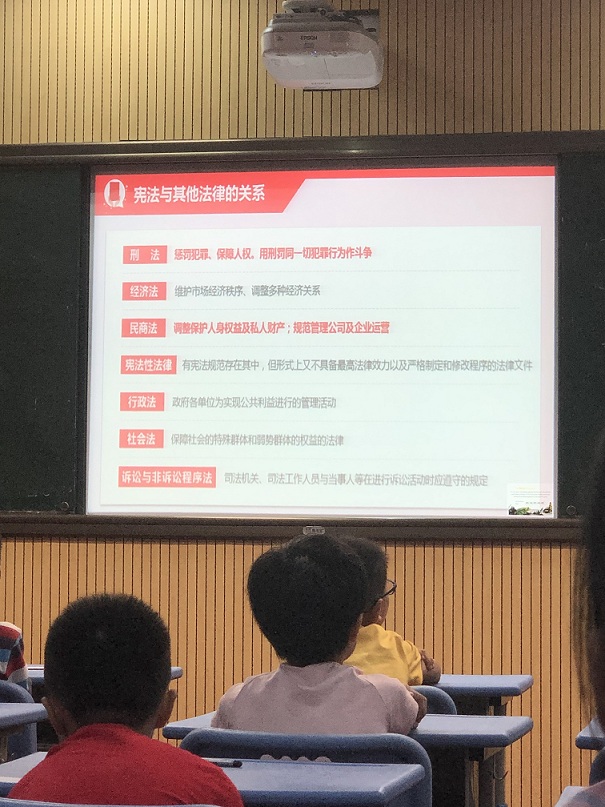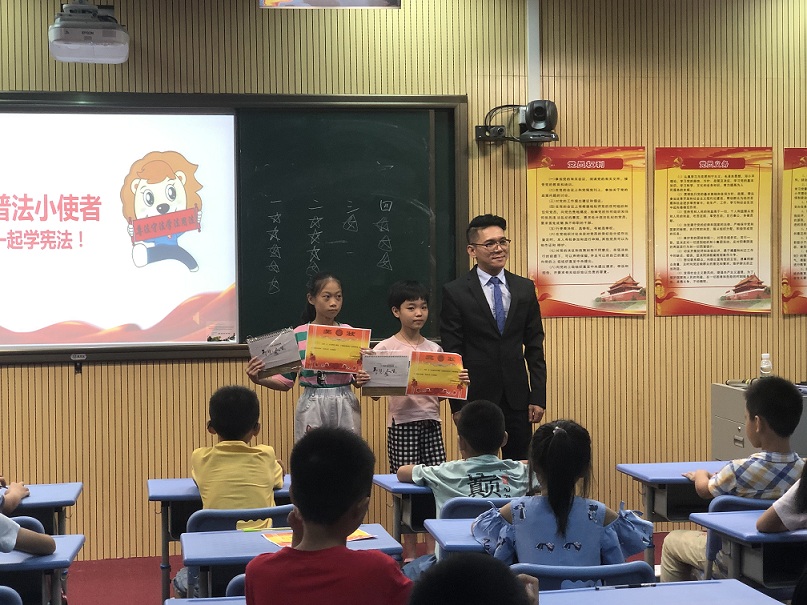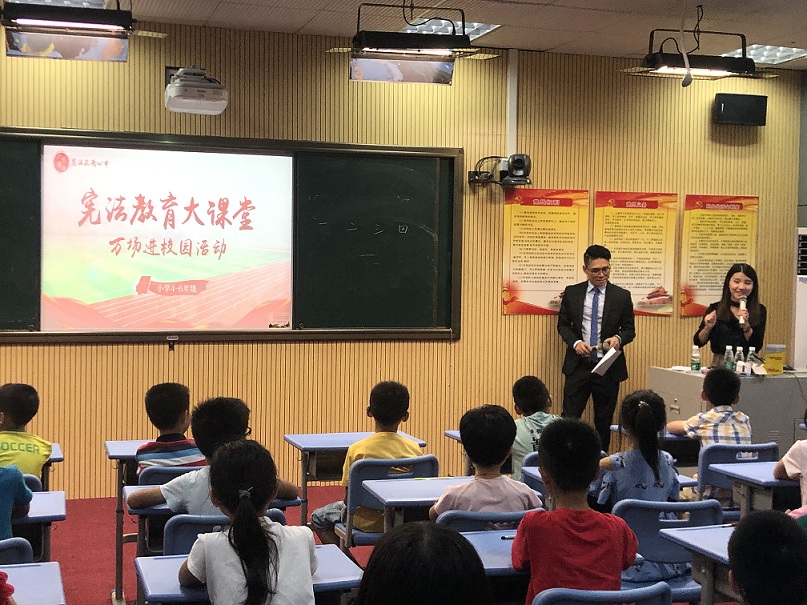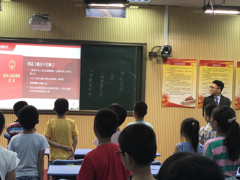 2019年7月11日下午,憲法在我心中――“憲法普法大課堂” 走進我們學校,由廣東聚理律師事務所的何忠良律師 和吳漫律師給孩子們授課。 “憲法教育大課堂”圍繞“尊崇憲法、學習憲法、遵守憲法、維護憲法、運用憲法”,組織開展面向孩子們的憲法學習宣傳教育活動。
