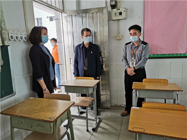 賴主任一行在甘鉅麟校長及學(xué)校行政的陪同下,邊巡查,邊提出對校園進行徹底清潔、消殺等要求;強調(diào)課室務(wù)必注重通風(fēng)和每天及時消毒,課間上洗手間分批進行等具體問題;建議飯?zhí)靡e峰就餐、單向就坐等。