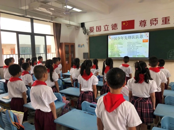 在課堂上,同學們認真地聆聽老師的講解,通過學習少先隊的歷史,激勵同學們從小就要養(yǎng)成良好的行為習慣,一起努力爭做合格的共產主義接班人。接著,學習自己佩戴紅領巾、正確佩戴好隊徽,嘹亮的中國少年先鋒隊隊歌在校園里回蕩。