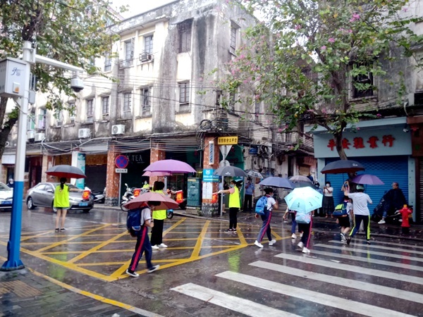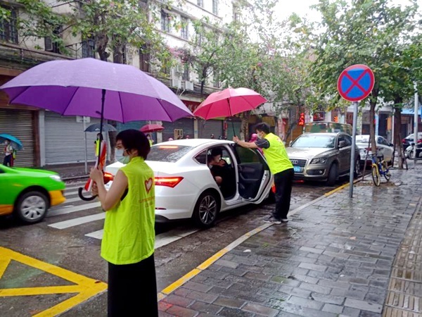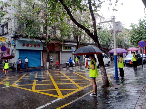 強(qiáng)對(duì)流天氣帶來短暫性暴雨,學(xué)校護(hù)衛(wèi)隊(duì)堅(jiān)守崗位,開始第一天的護(hù)校工作。為了保障順利開學(xué),早上6:50他們就早早來到高家基巷口,換好值日服裝,戴上防護(hù)手套,開始晨間工作。他們兵分多路,有的在路口疏導(dǎo)交通,有的引導(dǎo)家長(zhǎng)有序停車,還有的護(hù)送學(xué)生過馬路。他們?nèi)藬?shù)不多,但是分工明確:一部分是負(fù)責(zé)協(xié)助路邊下車的學(xué)生,攔停機(jī)動(dòng)車道車輛,以確保自身安全及學(xué)生能安全通行;另一部分是負(fù)責(zé)開關(guān)私家車車門,接送學(xué)生,以免造成道路擁堵。并且,由于在疫情期間,護(hù)衛(wèi)隊(duì)隊(duì)長(zhǎng)特別強(qiáng)調(diào):“所有隊(duì)員在值崗過程中不能觸碰學(xué)生及學(xué)生物品,人與人間保持至少1米以上安全距離,戴一次性手套?!边@一個(gè)個(gè)細(xì)節(jié)展示了學(xué)校護(hù)衛(wèi)隊(duì)工作的細(xì)致、認(rèn)真和用心。