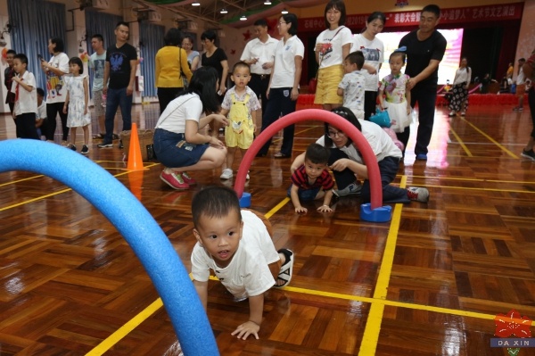 晚上7點(diǎn),大家紛紛來(lái)到了慶?;顒?dòng)的主會(huì)場(chǎng)----大信學(xué)校體育館。迎接孩子們的是充滿著節(jié)日氣氛的大舞臺(tái),每年的“六?一”所有的孩子都可以在這個(gè)大舞臺(tái)上一展才藝。隨著主持人的報(bào)幕聲響起,”現(xiàn)場(chǎng)立時(shí)成為一片歡樂(lè)的海洋!舞臺(tái)上傳來(lái)了小朋友的歌聲、朗通聲、街舞伴奏的音樂(lè)聲……小小年紀(jì)的寶貝們各有絕活,讓人羨慕!舞臺(tái)的對(duì)面是游園活動(dòng)的主陣地,六位義工老師已經(jīng)準(zhǔn)備就緒,面帶微笑迎接參加游園活動(dòng)的小伙伴們。“海底隧道”游戲位上,幾個(gè)步履蹣跚的小家伙在家長(zhǎng)的指引下匍匐前進(jìn),居然能順利通關(guān);“毽球入筐”孩子們投筐姿勢(shì)各異,大一點(diǎn)兒的孩子毫無(wú)懸念飛投入筐,小一點(diǎn)兒的孩子也不甘示弱,竟然“近距離入甕”,再小一點(diǎn)兒的孩子甩出的毽球與筐完全不沾邊,引得在旁的家長(zhǎng)們捧腹大笑?!白闱蛏溟T”“ 足球保齡球” “羽毛球顛球”每個(gè)攤位都有一群小粉絲,他們那專注的眼神,稚拙的動(dòng)作,引得在場(chǎng)家長(zhǎng)們的笑聲此起彼落,整個(gè)體育館沉浸在一片歡樂(lè)祥和中。