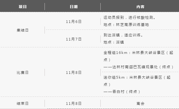 賽道詳細(xì)信息    備注:第二屆南迦巴瓦山地馬拉松賽主要由水泥路構(gòu)成,路寬約6米,全程緩上坡、緩下坡路段錯(cuò)落交織,參加選手應(yīng)注意佩戴好護(hù)膝等護(hù)具;比賽道路是該路段汽車(chē)通行的唯一路段,考慮到比賽期間汽車(chē)通行會(huì)對(duì)選手造成影響,賽事保障我們將會(huì)采取服務(wù)點(diǎn)+機(jī)動(dòng)摩托車(chē)應(yīng)急+收容車(chē)收尾的保障形式進(jìn)行,比賽開(kāi)賽后,如不是發(fā)生不可抗力的突發(fā)事件需要緊急調(diào)度汽車(chē)進(jìn)行處理,一律不允許汽車(chē)進(jìn)入賽道。   參賽資格   1)參賽運(yùn)動(dòng)員需完賽半程馬拉松或20公里(及以上)越野賽事,報(bào)名時(shí)需提交完賽證書(shū)以便審核。   2)因高海拔賽事,參賽運(yùn)動(dòng)員年齡限制男子18-48周歲,女子18-45周歲,部分高原本地選手經(jīng)組委會(huì)特別批準(zhǔn)可適當(dāng)放寬年齡限制。   報(bào)名費(fèi)用   報(bào)名費(fèi)200元(含1106-1108食宿)     參賽規(guī)則   ■規(guī)則1   本屆南迦巴瓦山地馬拉松比賽全程組在前,迷你組在后,一次鳴槍同時(shí)起跑。   ■ 規(guī)則2   關(guān)門(mén)點(diǎn)和時(shí)間限制:為保障參賽運(yùn)動(dòng)員的比賽安全、順利,比賽期間比賽路線(xiàn)設(shè)關(guān)門(mén)時(shí)間,限時(shí)進(jìn)行交通封閉,起跑至關(guān)門(mén)時(shí)間后,各路段恢復(fù)正常交通。在規(guī)定的關(guān)門(mén)時(shí)間內(nèi),未完賽的運(yùn)動(dòng)員須立即停止比賽,退出賽道,以免發(fā)生危險(xiǎn)。退出賽道的運(yùn)動(dòng)員可乘坐組委會(huì)提供的收容車(chē)到達(dá)終點(diǎn)處(如發(fā)生特殊情況,組委會(huì)有權(quán)決定提前結(jié)束比賽,運(yùn)動(dòng)員必須服從)。   ■ 規(guī)則3   組委會(huì)將會(huì)對(duì)起點(diǎn)、終點(diǎn)及關(guān)鍵路段進(jìn)行監(jiān)控,出現(xiàn)以下違反比賽規(guī)定的運(yùn)動(dòng)員將會(huì)取消比賽成績(jī),并追究其責(zé)任,在比賽中,因運(yùn)動(dòng)員利用虛假信息獲取參賽資格或者報(bào)名后由他人代跑等原因所發(fā)生的一切責(zé)任后果,均由運(yùn)動(dòng)員本人承擔(dān),在比賽的過(guò)程中,出現(xiàn)爭(zhēng)議或者其他特殊情況,則由裁判組決定。   ■ 規(guī)則4   參加馬拉松比賽的運(yùn)動(dòng)員須按照規(guī)定的存放點(diǎn)存放個(gè)人物品,貴重物品不要存放在包內(nèi)。運(yùn)動(dòng)員可以在完成比賽后14:00前到指定存放地點(diǎn)領(lǐng)取個(gè)人物品。如超過(guò)領(lǐng)取時(shí)間沒(méi)有領(lǐng)取,可于第二天到賽事組委會(huì)領(lǐng)取,如5日之內(nèi)不領(lǐng)取,組委會(huì)將會(huì)按照無(wú)人領(lǐng)取處理。   ■ 規(guī)則5   組委會(huì)沿馬拉松路線(xiàn)每5公里設(shè)置補(bǔ)給點(diǎn)(含醫(yī)療點(diǎn)、補(bǔ)給點(diǎn)、流動(dòng)廁所),每2.5公里設(shè)置用水站。每個(gè)服務(wù)點(diǎn)前50米會(huì)有明顯標(biāo)記,運(yùn)動(dòng)員可根據(jù)實(shí)際情況自行選擇。   ■ 規(guī)則6   運(yùn)動(dòng)員至少提前30分鐘完成參賽檢錄工作。   ■ 規(guī)則7   所有運(yùn)動(dòng)員比賽時(shí)可根據(jù)自身情況選擇佩帶護(hù)膝等護(hù)具。   ■ 規(guī)則8   所有運(yùn)動(dòng)員應(yīng)充分認(rèn)識(shí)運(yùn)動(dòng)潛在的危險(xiǎn),并根據(jù)競(jìng)賽規(guī)程的要求購(gòu)買(mǎi)保險(xiǎn),自行承擔(dān)賽事風(fēng)險(xiǎn),沒(méi)有購(gòu)買(mǎi)保險(xiǎn)的運(yùn)動(dòng)員不得參賽。正確審視自身身體狀況,提前鍛煉使自身能夠適應(yīng)比賽的強(qiáng)度(含高血壓、心臟病、心腦血管疾病等不能參加該比賽)。   ■ 規(guī)則9   所有運(yùn)動(dòng)員在比賽中必須保持公平、公正的競(jìng)賽精神,遵守比賽規(guī)則,注意安全,不做可能引起自己或他人受傷害的冒險(xiǎn)或有意行為;對(duì)上述行為,組委會(huì)有權(quán)對(duì)其行為采取警告、禁止比賽、取消成績(jī)等措施,對(duì)上述行為引起的一切責(zé)任與后果均由違規(guī)者承擔(dān)并取消比賽成績(jī)。   賽事獎(jiǎng)勵(lì)   本次賽事將對(duì)全程組16公里男女前二十名選手進(jìn)行獎(jiǎng)勵(lì),獎(jiǎng)勵(lì)如下:   保障團(tuán)隊(duì)   (一)疫情防控及醫(yī)療保障團(tuán)隊(duì):本次比賽由林芝市市衛(wèi)健委及醫(yī)院醫(yī)護(hù)人員組成疫情防控及醫(yī)療保障團(tuán)隊(duì),制定疫情防控方案并組織開(kāi)展防疫工作;在賽道上設(shè)置醫(yī)療點(diǎn),保障參賽選手的生命安全。  ?。ǘ┑缆繁U蠄F(tuán)隊(duì):為確保本次比賽的道路保障,林芝市特組織林芝公路分局、市交通運(yùn)輸局、米林縣交通運(yùn)市局等單位,在開(kāi)賽前組織相關(guān)人員,對(duì)比賽道路進(jìn)行路面清理及路面檢修。  ?。ㄈ┌踩U蠄F(tuán)隊(duì):為確保本次比賽突發(fā)事件應(yīng)急處理,林芝市特組織市公安局、市消防救援支隊(duì)、市應(yīng)急管理局、米林縣公安局等單位,制定賽事突發(fā)事件應(yīng)急處置方案,保障賽事的正常進(jìn)行。  ?。ㄋ模┦称钒踩U蠄F(tuán)隊(duì):為確保本次比賽嘉賓、運(yùn)動(dòng)員、裁判員、工作人員的食品安全,林芝市特組織市市場(chǎng)監(jiān)管局及米林縣市場(chǎng)監(jiān)