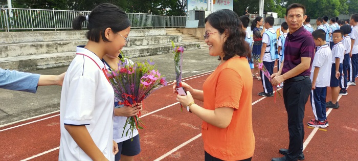 在莊嚴(yán)肅穆的升旗儀式過后,慶祝第36個(gè)教師節(jié)暨頒獎(jiǎng)典禮正式開始。頒獎(jiǎng)典禮上,在劉木勛主任的主持下,全體善雅學(xué)子們滿懷深情的喊一聲:老師,祝您節(jié)日快樂!在這個(gè)特殊節(jié)日里,學(xué)生們真摯的祝福就是對(duì)老師們最深情的告白。接著,在全校師生熱烈的掌聲中和注目下,“最美年級(jí)、最美備課組、最美備課組長(zhǎng)、最美教學(xué)能手、最美班主任”的教師獲得者分批走上主席臺(tái),接受劉喜全校長(zhǎng)頒發(fā)的榮譽(yù)證書以及學(xué)生代表送上的鮮花。與此同時(shí),臺(tái)下的同學(xué)們?cè)缫哑炔患按慕o老師們獻(xiàn)上自制手工藝品、寫滿祝福的賀卡、鮮花等小禮物表達(dá)對(duì)老師的感謝和祝福,每一份禮物和祝福都飽含著學(xué)生對(duì)老師深深的愛。在一聲聲“祝老師節(jié)日快樂”“老師,您辛苦了!”的節(jié)日祝福中,老師們接過鮮花、小禮物,臉上掛滿了幸福的笑容。學(xué)生的心意讓這個(gè)屬于老師們自己的節(jié)日變得更加絢麗,整個(gè)校園頓時(shí)洋溢在尊師重教、感恩的歡樂海洋之中。