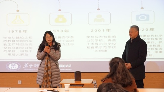 上午,工作室成員們走進(jìn)華中師范大學(xué)附屬小學(xué)桂子山校區(qū),校園布局合理、自然和諧,濃郁的現(xiàn)代化氣息迎面而至。儒雅的沈愛華校長(zhǎng)一邊帶領(lǐng)大家參觀校園文化,一邊將學(xué)校歷史如數(shù)家珍般地娓娓道來(lái)。華中師范大學(xué)附屬小學(xué)將創(chuàng)建現(xiàn)代化工作視為學(xué)校轉(zhuǎn)型發(fā)展、邁向現(xiàn)代的重要戰(zhàn)略機(jī)遇,把“陽(yáng)光少年,未來(lái)領(lǐng)袖”定為育人內(nèi)涵,建構(gòu)“四行”“五節(jié)”“六禮”育人體系,在家校共育四修課程中探索出了一條創(chuàng)新之道。