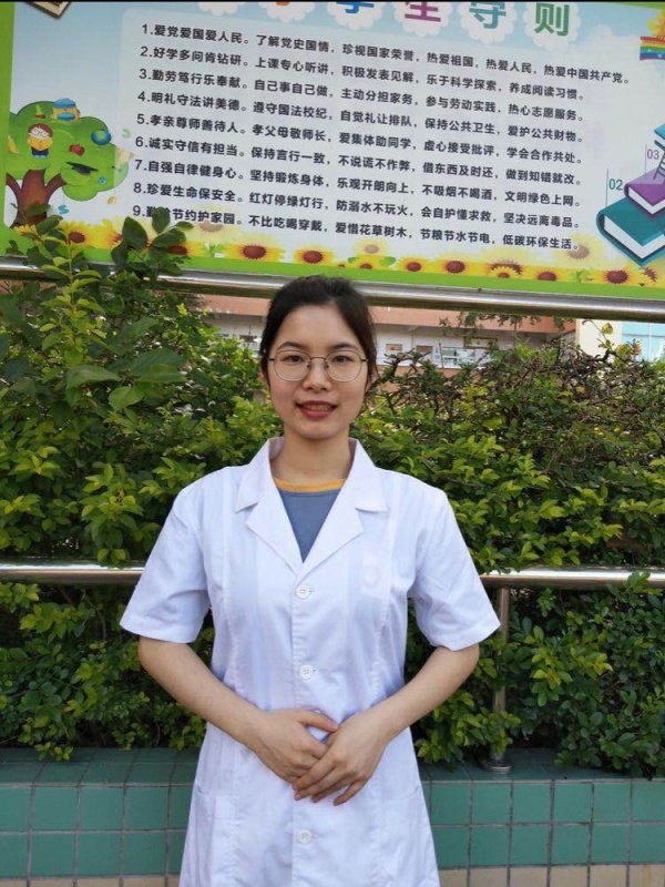 陳婷婷老師既是學(xué)校的校醫(yī),也是衛(wèi)生教師,每天面對著活潑可愛的小學(xué)生,她的日常工作是幫助他們學(xué)習(xí)、了解、掌握有關(guān)預(yù)防疾病、合理膳食、合理用藥等維護健康的知識與技能,增強自我主動健康意識,不斷提高健康管理能力??粗⒆觽兊某砷L,陳婷婷老師覺得很有成就感,很享受這份工作。