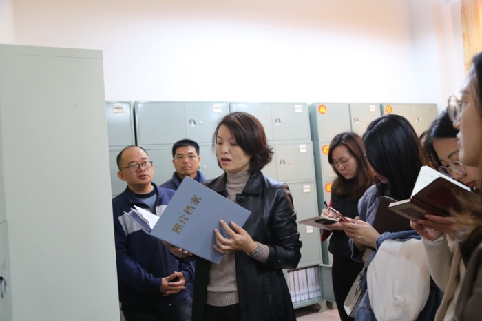 第一階段,與會活動人員集中到東升中學(xué)檔案館進(jìn)行實物參觀。梁老師就東升中學(xué)檔案布局、實物陳列以及文本文檔應(yīng)該如何擺放陳列,以及檔案室管理進(jìn)行了現(xiàn)場指導(dǎo)講解。她提醒參觀人員,檔案陳列擺放以及檔案室管理要做到細(xì)致規(guī)范。就各中小學(xué)檔案管理員提出的問題,梁老師給予了細(xì)致解答。