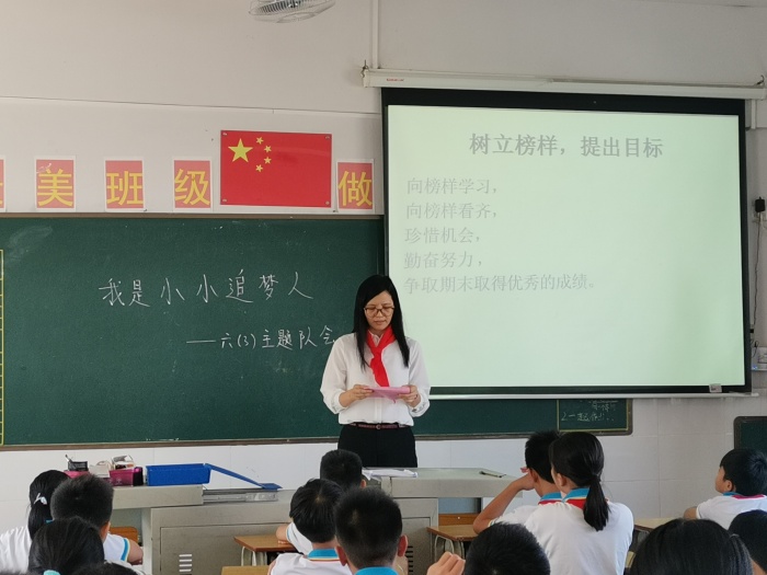 下午,各中隊召開了“我是小小追夢人”為主題的建隊日隊會。學(xué)校特別邀請港口鎮(zhèn)少工委成員陳宇環(huán)校長到六(3)班參與主題隊會活動。主題活動在嘹亮的《出旗曲》樂聲中拉開序幕,各中隊在班級整齊列隊,少先隊員們精神抖擻,氣宇軒昂,齊唱《中國少年先鋒隊隊歌》。接著,各中隊結(jié)合“自主管理、自主發(fā)展”內(nèi)容,總結(jié)上學(xué)期學(xué)習(xí)成績,為學(xué)習(xí)標兵頒獎,并以此為契機讓隊員們提出本學(xué)期目標,向榜樣看齊。鎮(zhèn)少工委成員陳宇環(huán)校長鼓勵少先隊員:“隊員們,你們是祖國的未來和希望,你們是新世紀的雛鷹,今天,你們磨練羽翼;明天,你們就會搏擊長空!是金子,總有放光的時候;是玫瑰,總有盛開的時候。我相信,在梁校長的帶領(lǐng)下,在我們老師的努力下,少先隊員更加的健康上進,要樹起學(xué)習(xí)榜樣,你追我趕,做個‘小小追夢人’!”“準備著!為實現(xiàn)共產(chǎn)主義事業(yè)而奮斗!”“時刻準備著!”在飄揚的隊旗前各中隊輔導(dǎo)員帶領(lǐng)少先隊員進行莊嚴宣誓,雄壯的誓言,鏗鏘有力的呼號響徹校園。