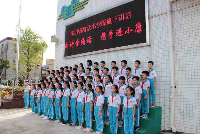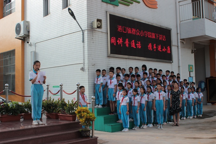港口群眾小學推普周啟動儀式在本月下旬正式拉開帷幕。周一升旗禮上,伴隨著徐徐升起的國旗,五(3)班的學生代表在國旗下進行了演講,他介紹了推廣普通話和使用規(guī)范字的意義,對全體師生發(fā)出了“推廣普通話,使用規(guī)范字”的倡議?! ?/p>