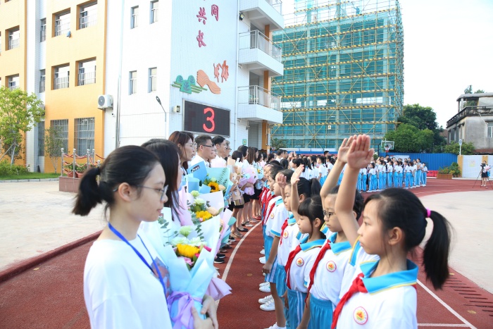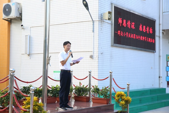 莊嚴的升旗儀式后,少先隊代表為老師們獻上了誠摯的祝福,發(fā)自肺腑的話語表達了對教師深深的敬意與感恩。接著,榮獲2020“中山市優(yōu)秀教師”稱號的教師代表關(guān)家聲老師上臺發(fā)言,他道出了廣大教師的心聲——為了學(xué)生的健康成長,為了黨的教育事業(yè),我們愿意默默奉獻、無怨無悔!