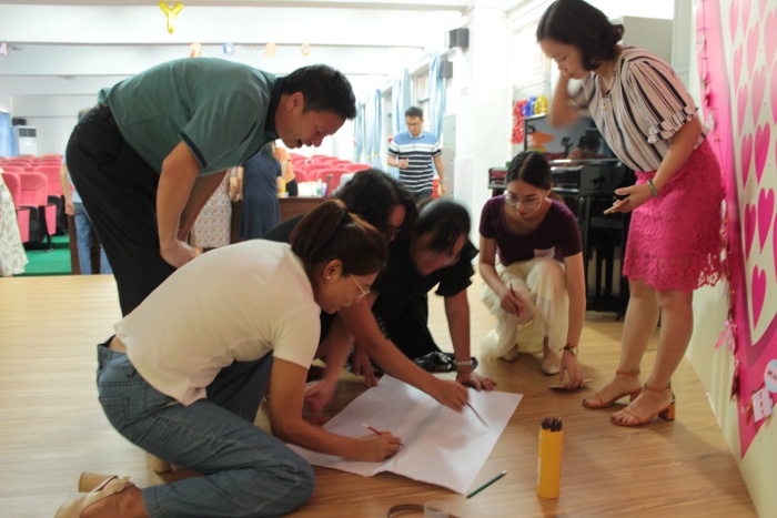 第二環(huán)節(jié)是團(tuán)隊(duì)建設(shè)和挑戰(zhàn)。全體教師被隨機(jī)分成7個(gè)小組,每個(gè)成員集思廣益,共同為自己的小組取隊(duì)名、想口號(hào)、編展示動(dòng)作。特別在“共同創(chuàng)作一幅畫”這一活動(dòng)中,每個(gè)小組的凝聚力、向心力在挑戰(zhàn)面前被激發(fā)并無限放大,大家全身心地投入到創(chuàng)作中,群策群力、團(tuán)結(jié)協(xié)作,在短時(shí)間內(nèi)出色地完成一幅幅飽含情懷、寓意深長(zhǎng)的作品。各團(tuán)隊(duì)精彩而忘情地詮釋作品的內(nèi)涵,掌聲伴隨著感動(dòng)陣陣響起,團(tuán)隊(duì)凝聚力在這一刻被激發(fā)了。