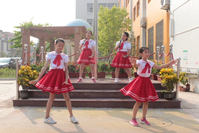這時(shí),升旗臺(tái)前忽然出現(xiàn)了四位美麗可愛的“小精靈”。美妙的音樂悠揚(yáng)響起,跟隨著音樂,小精靈們邊唱歌邊跳起了優(yōu)美的舞蹈。兩旁四(1)和四(2)班的同學(xué)們也伴隨著音樂自信地唱了起來。歌聲是如此動(dòng)聽,舞姿是如此優(yōu)美,臺(tái)下的老師和同學(xué)被這突如其來的驚喜感染了,完全沉浸其中,甚至情不自禁地跟著哼了起來。原來這就是凝聚了全校師生的智慧,經(jīng)大家共同努力創(chuàng)作而成的新校歌——《我們幸福快樂成長(zhǎng)》呀!在這特別的日子里首次亮相,真是一份意義非凡的開學(xué)禮物??!