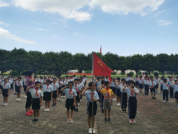 伴隨著激昂的入場音樂,一年級各班排列著整齊的隊伍來到升旗臺前,同學們個個昂首挺胸,精神抖擻,期待著入隊那一刻的到來。首先,主持人宣布新生入隊儀式正式開始,全體學生奏唱《中國少年先鋒隊隊歌》,由呂月歡主任宣讀批準入隊決定,緊接著,六年級少先隊員代表手捧紅領巾入場,為新隊員佩戴紅領巾,由老隊員檢查新隊員隊禮并糾正。呂主任帶領全體隊員宣誓,隊員們聲音洪亮,神情莊嚴,老隊員代表表達了對新隊員的祝愿。最后,梁麗鴻副校長為一年級6個中隊授予新中隊隊旗,并對新入隊的隊員們表示衷心的祝福,提出了美好的希冀。