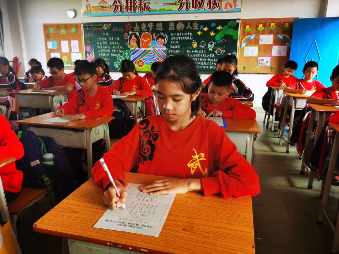 本次活動要求學生全員參與,比賽以各年級選定的古詩詞為書寫內(nèi)容,采取現(xiàn)場書寫形式。一、二年級用鉛筆,三至六年級用鋼筆(或圓珠筆)。比賽現(xiàn)場,參賽學生個個滿懷激情,用心書寫每一個筆畫、每一個漢字。同學們握筆正確,坐姿端正,表現(xiàn)出良好的書寫習慣,所寫作品筆畫流暢,橫平豎直,結(jié)構(gòu)勻稱,整體美觀,在短短的二十分鐘內(nèi)現(xiàn)場完成自己的作品。