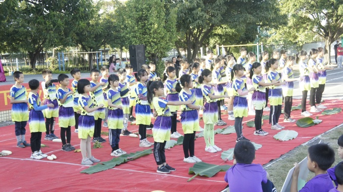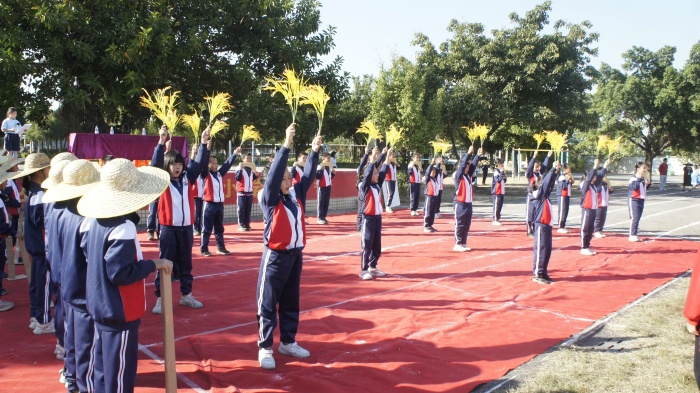 緊接著,各班特色方隊(duì)依次入場(chǎng),他們精神抖擻,燦爛的笑容抒寫(xiě)著他們的熱情,激昂的口號(hào)透露出他們的堅(jiān)定。各支隊(duì)伍各有特色,各隊(duì)伍結(jié)合學(xué)校水鄉(xiāng)文化特色,充分挖掘水鄉(xiāng)元素資源,有的扛著鋤頭、有的提著籃子,準(zhǔn)備春種;中年級(jí)的孩子們穿著鮮艷的水鄉(xiāng)服裝,打著雨傘、帶著草帽在田原里、土地里忙活著除草、殺蟲(chóng)、施肥等;高年級(jí)的同學(xué)們卻忙著收成,他們?cè)谇锛敬筘S收,金黃的稻谷、肥壯的蘿卜、番薯、玉米···,還有一串串的大香蕉呢。各班用舞蹈、歌唱、吟誦、模仿勞作場(chǎng)景等豐富的形式,把水鄉(xiāng)一年中春種—夏忙—秋收表現(xiàn)得淋漓盡致,讓現(xiàn)場(chǎng)的觀眾看得津津樂(lè)道。