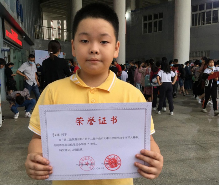 這次書寫大賽,全市共收到六百多份硬筆和軟筆作品,港口鎮(zhèn)下南小學(xué)李文駿同學(xué)作為最年幼的選手在全市小學(xué)組軟筆書法項目中斬獲一等獎,入選代表中山市參與省賽。