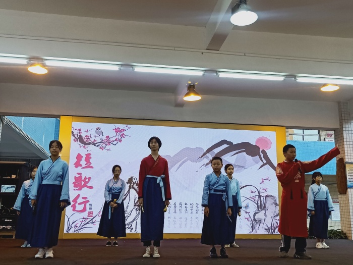 最后,學(xué)校誦讀社團(tuán)獻(xiàn)上了他們別出心裁的表演——《短歌行》。各位誦讀愛好者們以“山不厭高,海不厭深。周公吐哺,天下歸心”二句曹孟德的肺腑之言收束全場(chǎng),回環(huán)往復(fù),蕩氣回腸。