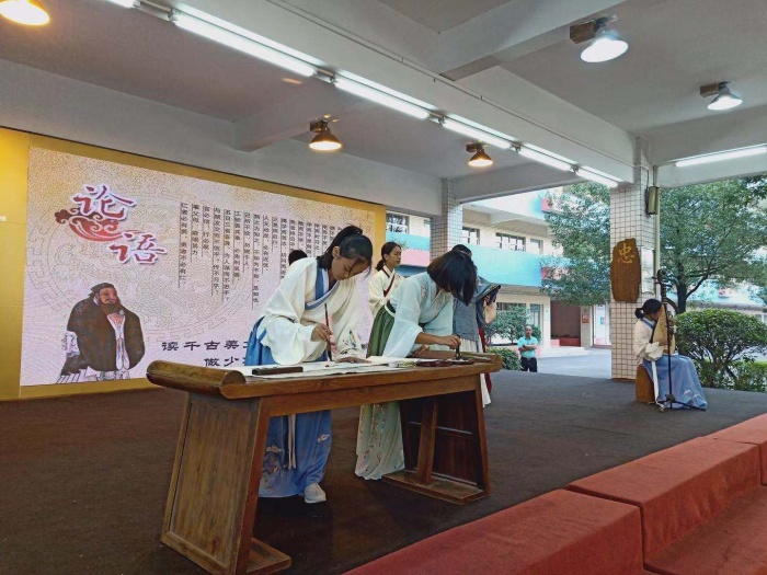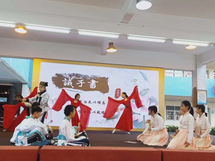 決賽在同學(xué)們的歡呼聲中拉開序幕。率先登場(chǎng)的是《琴聲悅耳書墨賞心——<論語>經(jīng)典誦讀》節(jié)目。有道是:“天不生仲尼,萬古如長夜”,在悅耳的琵琶聲中我們一覽圣人之風(fēng)采,重溫圣人之教誨。接著是《蘇軾詞三首》,須眉多鐵骨,殊不知柔腸也丈夫。6名演出者一襲青衣,演不盡的是蘇軾的俊逸與浪漫,道不完的是他的樂觀與曠達(dá),兩名舞者在旁循聲起舞,好不讓人心生歡喜!諸葛家書代代傳,修身立德孝圣賢。一(12)的《誡子書》把現(xiàn)場(chǎng)的氛圍燃至了最高點(diǎn)。一個(gè)可愛的“諸葛亮”緩緩向舞臺(tái)中央走去,手持羽毛扇,頭戴綸巾,在學(xué)童心間播撒智慧的種子;12名“學(xué)童”席地而坐,吟誦著圣賢之語;3名紅衣舞者應(yīng)節(jié)而舞,給人以視覺聽覺極大的享受。