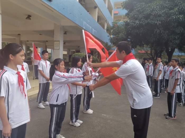 學(xué)校大隊(duì)輔導(dǎo)員陳榮欣老師宣讀建隊(duì)決定,學(xué)校團(tuán)委副書記王宙老師為初一年級(jí)各中隊(duì)授中隊(duì)旗。星星火炬,代代相傳。在新一屆中隊(duì)長(zhǎng)正式接過隊(duì)旗的那一刻,他們接過的更是一份責(zé)任與使命。學(xué)校少工委副主任張紅霞老師為新一屆中隊(duì)輔導(dǎo)員頒發(fā)聘書;初一年級(jí)各班中隊(duì)長(zhǎng)為輔導(dǎo)員老師敬獻(xiàn)紅領(lǐng)巾。
