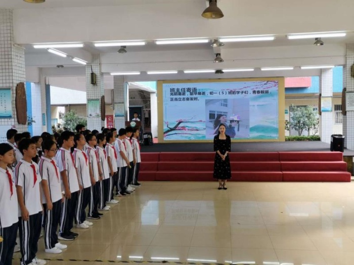 有的班級熱愛古詩詞,展示出了他們的詩歌底蘊(yùn);有的班級擅長傳統(tǒng)民樂器,葫蘆絲現(xiàn)場伴奏,樂音裊裊;有的班級充滿書香文化氣息,同學(xué)們站得筆直,氣質(zhì)出眾;有的班級渴望如雄鷹高飛,表現(xiàn)出他們力爭上游的決心;孩子朝氣蓬勃,充滿活力。稚嫩的初一新生,身上有一股不服輸?shù)膭牛杭w宣誓時(shí)聲音一班比一班高;比拼才藝,哪個(gè)班都不甘示弱,新生們?nèi)诵∧懽哟螅瑐€(gè)人獨(dú)唱、民族舞個(gè)人秀、街舞表演等才藝表演隨手拈來;各個(gè)班級著裝整齊,系著鮮艷的紅領(lǐng)巾大聲說出對自己的期望、對老師的感謝、對父母的感恩、對祖國的熱愛……