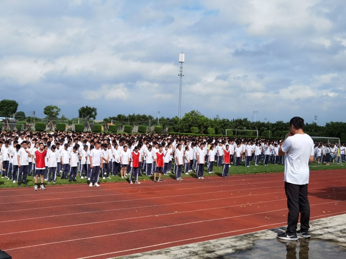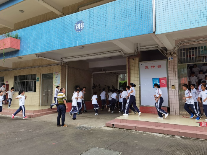 9月18日上午9:35,緊急疏散演練正式開始。隨著警報聲響起,正在課室的教師立即組織學(xué)生從課室緊急撤離,有序地疏散到足球場,迅速集隊(duì),完成人數(shù)清點(diǎn)、人數(shù)報告以及計時任務(wù)。