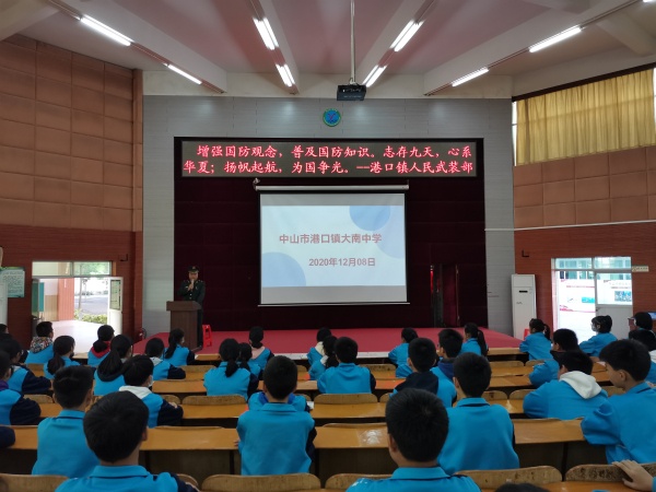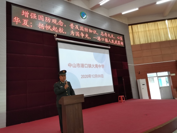 為進一步普及國防知識,增強學生的國防觀念,培養(yǎng)學生的愛國主義精神,2020年12月8日港口鎮(zhèn)大南中學在階梯室舉行了國防教育知識講座。此次講座由港口鎮(zhèn)人民武裝部副部長賀洪彪同志主講。